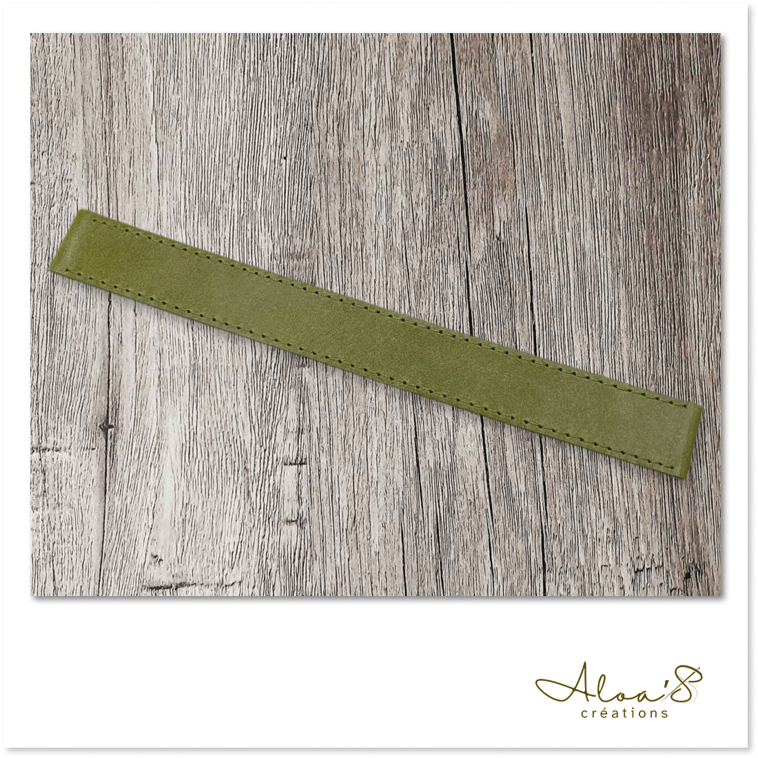 Découvrez le bracelet de montre lanière en cuir de vachette vert olive verni, une création artisanale réalisée sur mesure pour accompagner les montres iconiques à lanières interchangeables comme Ma Première de Poiray ou Steel d’OJ Perrin*.