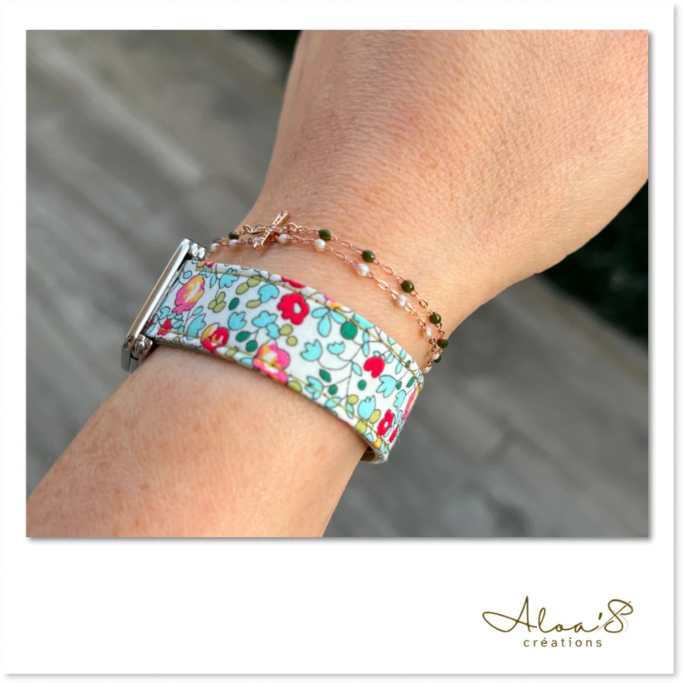 Découvrez notre bracelet lanière en tissu liberty of London « Eloïse mint », un accessoire artisanal et sur mesure pensé pour sublimer votre montre type Poiray ou OJ Perrin.*
