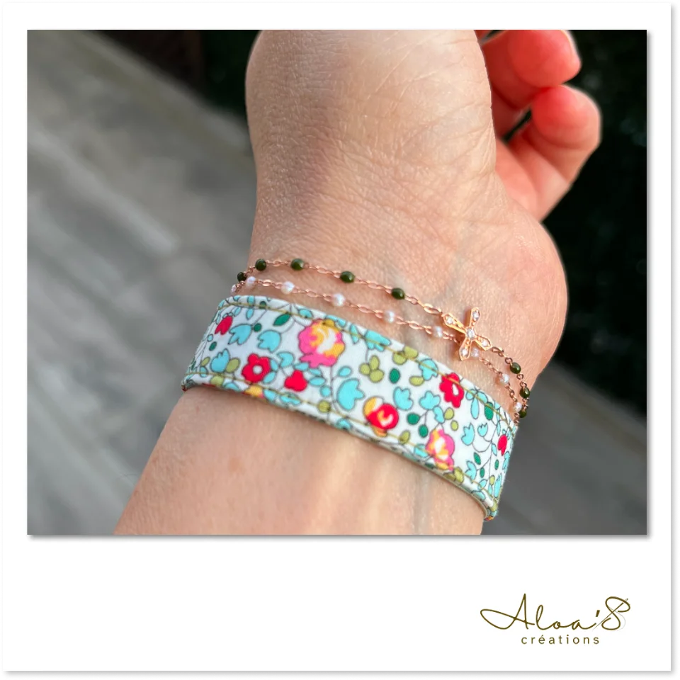 Si vous le souhaitez, je peux confectionner votre bracelet directement à partir d’un tissu que vous m’aurez confié. Cela permet de créer une pièce parfaitement assortie à l’une de vos tenues coup de coeur ou de donner une seconde vie à un textile auquel vous tenez particulièrement.
