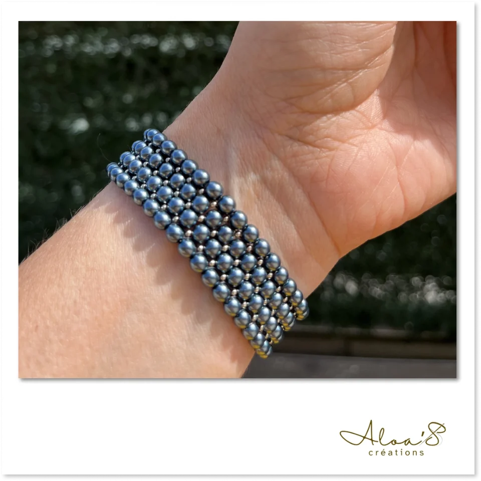 J’utilise des fils Miyuki ou C-Lon, des fils nylon reconnus pour leur grande résistance, qui garantissent la solidité et la tenue du bracelet dans le temps.