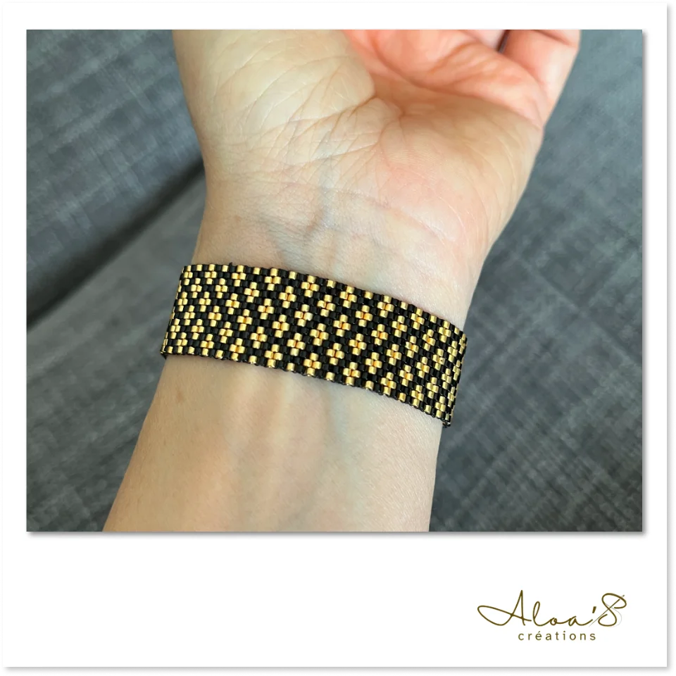 Le tissage peyote offre une souplesse exceptionnelle tout en garantissant une solidité remarquable grâce à l’enfilage perle à perle et aux multiples passages de fil dans chaque perle. Les perles s’emboîtent parfaitement, créant un bracelet à la fois fluide et résistant.