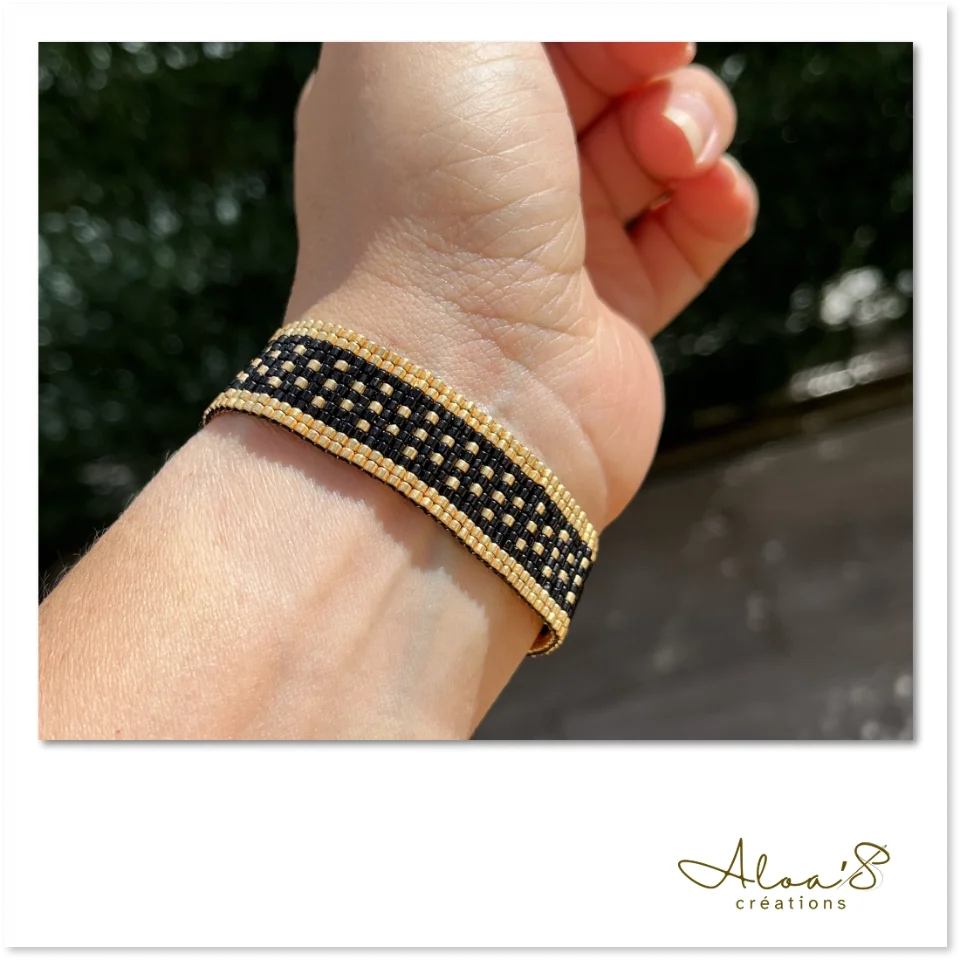 J’utilise des fils Miyuki ou C-Lon, des fils nylon reconnus pour leur grande résistance, qui garantissent la solidité et la tenue du bracelet dans le temps.
