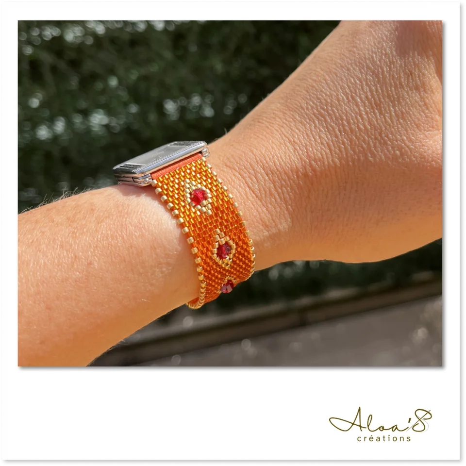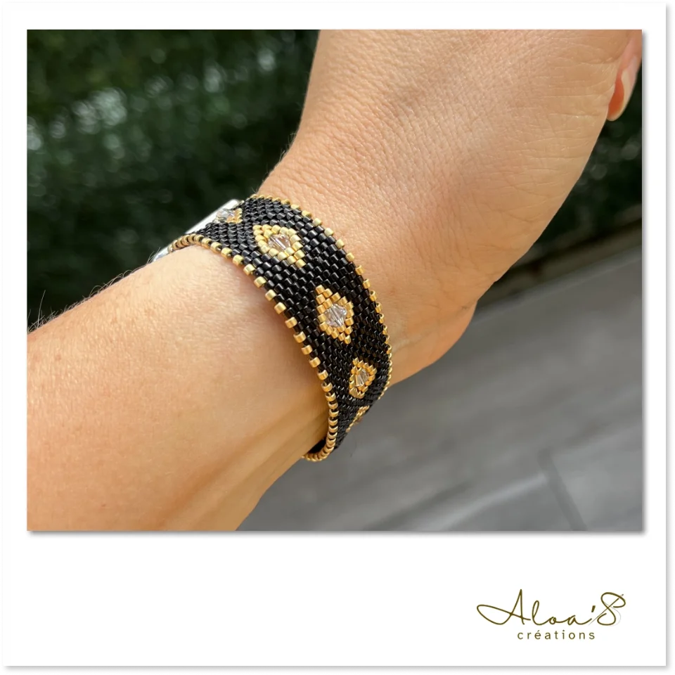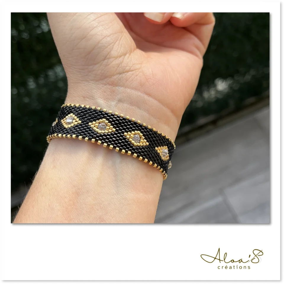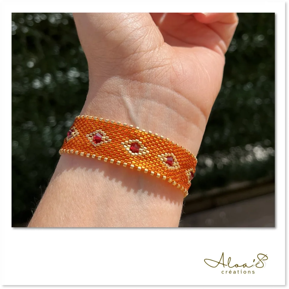 Le tissage peyote offre une souplesse exceptionnelle tout en garantissant une solidité remarquable grâce à l’enfilage perle à perle et aux multiples passages de fil dans chaque perle. Les perles s’emboîtent parfaitement, créant un bracelet à la fois fluide et résistant.
