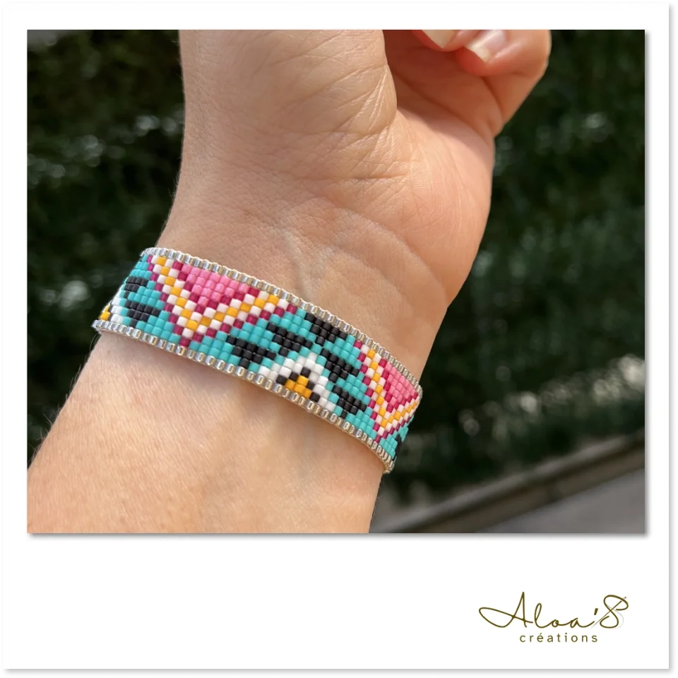 J’utilise des fils Miyuki ou C-Lon, des fils nylon reconnus pour leur grande résistance, qui garantissent la solidité et la tenue du bracelet dans le temps.
